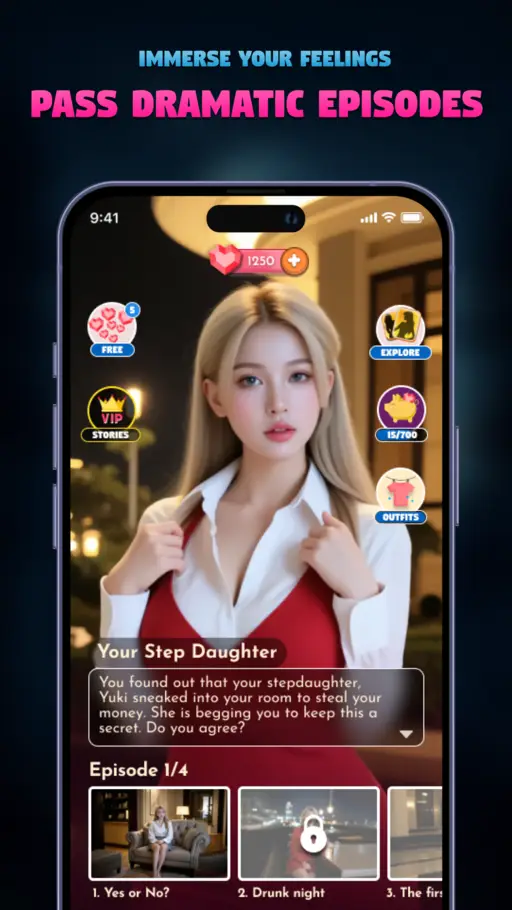 The first episode of every Story is free. Unlock additional episodes with Gems or through VIP access, and earn rewards like exclusive AI-generated visuals or special NPC outfits for completing story goals.